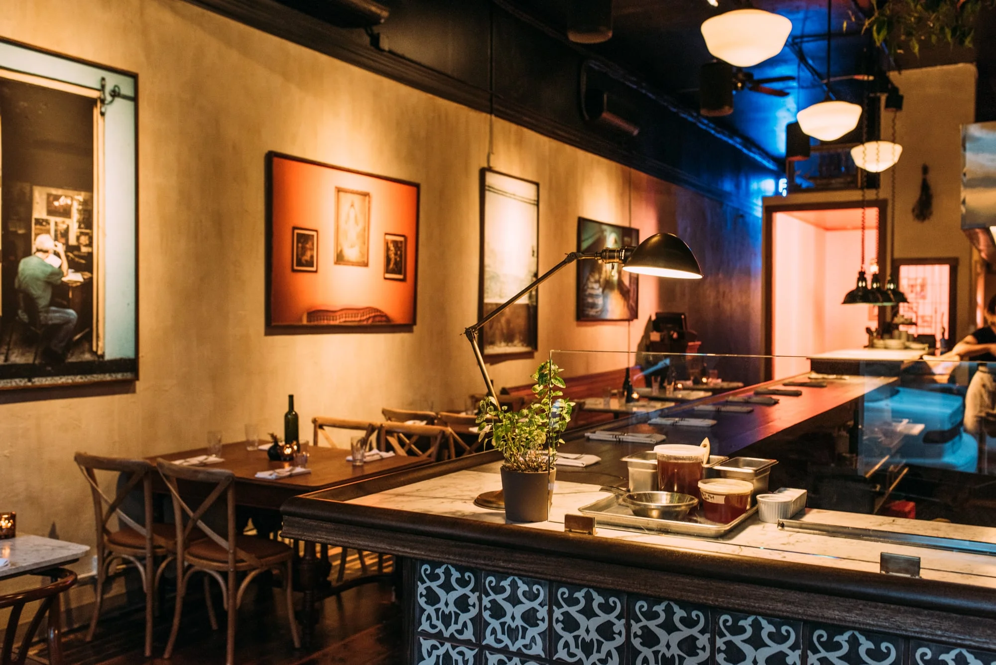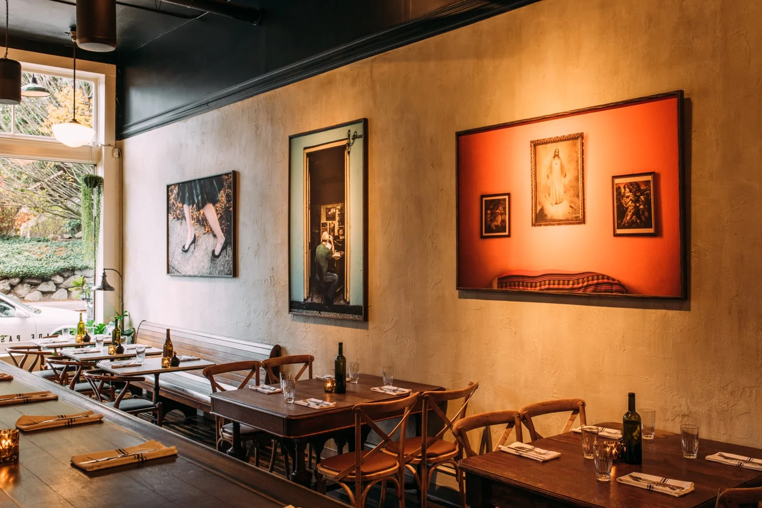 Although the restaurant has a certain Italian elegance, Lajeunesse’s inspiration was global: “The dark wood finish, floor tiles, brass inlays and accents were all inspired by a trip to Buenos Aires in 2014. I fell in love with all the 100-year-old cafés and bars that lined neighborhoods like San Telmo, and I wanted to bring that same spirit to this project and space.”